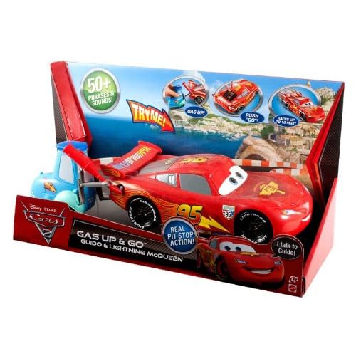 Cars 2 Gas Up & Go Guido and Lightning McQueen: Inspired by the new hit Disney/Pixar film, Cars 2. Fill ‘er up! Help Guido get Lightning McQueen fueled up for his next race. The more gas pumped from Guido’s gas can, the faster McQueen goes, watch his wheels spin! Get ready to gas up, gear up and race! Includes large scale Guido and Lightning McQueen vehicles. Kids will love reenacting their favorite scenes from the movie with the Cars 2 Gas Up & Go Guido and Lightning McQueen.