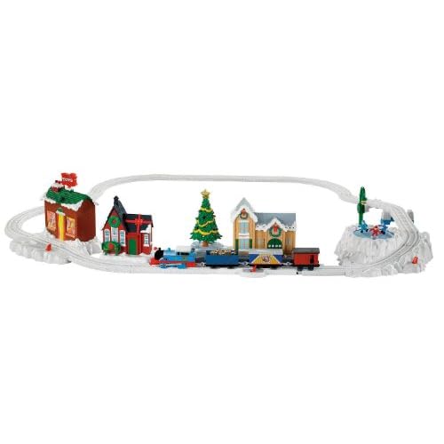 Merry Christmas from Thomas and his friends! Thomas is ready to bring holiday cheer to everyone on the Island of Sodor. He passes the toy shop, the school, children skating on the pond, and the beautifully lit Christmas tree as he delivers gifts all around the island! Motorized Thomas powers animated features: Sir Topham Hatt pops out dressed as Santa Claus at the station house and the pond with ice skaters rotates. As he stops at the toy shop, he powers the sign to spin and light-up! Includes motorized Thomas, a light-up Christmas tree and toy shop, school, station, ice-skating rink, festive holiday music, snow-covered track and more. Over eleven feet of track that fits around most Christmas trees! Motorized train track play is compatible with all TrackMaster track sets (sold separately). Requires 10 AA batteries (not included).