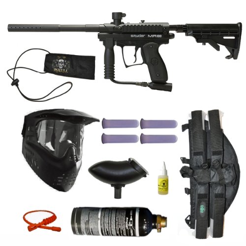 Spyder MR1 Paintball Marker Gun 3Skull 4+1 Mega Set + Condom Comes with Black Spyder MR100 (.68 caliber). The Spyder MR100 Paintball Marker will not rust, even when you're trekking through the wettest terrain, and you can play hard knowing you have a marker that will withstand anything you throw its way? This Marker has a two finger trigger and a contoured grip with integrated side panels matte black finish and a Drop forward with a Steel braided bottomline air feed and a Off-set feed neck for true rifle like sighting. Also has an Anti-double feed ball detent and top cocking bolt Package Includes Spyder MR1 Paintball Marker 20 oz Co2 Tank (shipped empty) GXG XVSN Mask with Visor & Anti Fog Lens 3Skull 4+1 Deluxe Paintball Harness Black 4 - 140 Round Heavy Duty Ultimate Paintball Clear Tubes 3Skull 21" Orange Jerk Squeegee Paintball Barrel Condom 3Skull 200 Round Black Hopper 1oz Gold Cup Oil