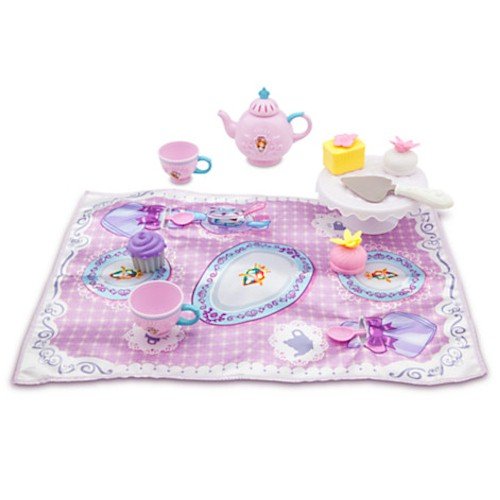 Set includes teapot with lid, two tea cups, two play cookies, two spoons, play cake, play cupcake, serving spatula, and serving tray with base Plus satin placemat Sofia screen art Learn to have tea like a princess! Includes one Magical collector's Card Ages 3+ Plastic Play pieces up to 5 1/4'' W Mat 12 1/2'' x 17 1/2''
