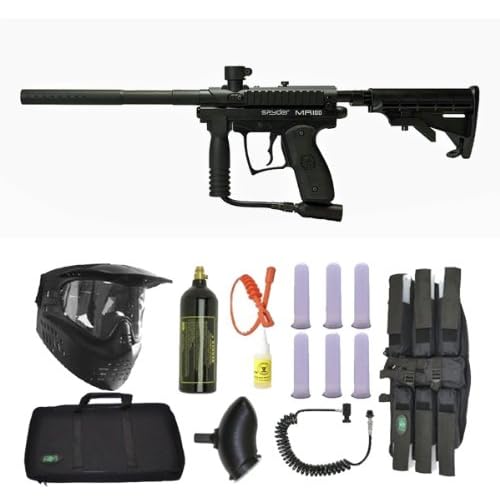 Spyder MR100 Pro Paintball Gun Marker Sniper Set Black The Spyder MR100 Pro Semi-Auto Paintball Marker has what you need to enhance your game. The marker features an air efficient Eko Valve system that shoots up to 1,600 shots from a 20 oz CO2 tank. It also has a high impact polymer clamping feed neck and an aluminum, multiple side picatinny rail mounting system for mounting accessories. With its adjustable car shoulder strap, you can transport your marker in comfort. Package Includes 2012 Spyder MR100 Paintball Marker GXG XVSN Mask with Visor & Anti Fog Lens 3Skull 6+1 Deluxe Paintball Harness Black 6 - 140 Round Heavy Duty Ultimate Paintball Clear Tubes 1oz Gold Cup Oil 3Skull 21" Orange Jerk Squeegee 20 Ounce CO2 Tank(empty) 3Skull 21" Padded Gun Case Black 3Skull Heavy Duty Coiled Remote with QD On/Off 3Skull 200 Round Gravity Feed Hopper 2012 Spyder MR100 Features Military Style Paintball Marker Spyder MR100 Eko Valve System (Patent Pending) shoots up to 1500 shot from a 20oz CO2 Tank High Impact Polymer Clamping Feedneck Two Finger Trigger Matte Anodized Finish Aluminum Side Picatinny Rail Mounting System Spyder MR100 High Impact Polymer M14 Style Vertical Fore-grip Spyder MR100 Aluminum Trigger Frame Pull Pin Top Cocking Delrin Bolt Quick Disconnect Pin One Piece Velocity Adjuster/Spring Guide Spyder MR100 Anti-Double Feed Ball Detent Spyder MR100 Steel Braided Hose Line
