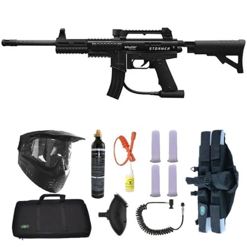 Package Includes New Spyder Stormer Semi-Automatic Marker GXG XVSN Black Mask 350 Round 50 Caliber Black Hopper 9 oz C02 Tank (C02 not included) Premium Oil 3Skull 4+1 Harness Black 4 - 140 Round Heavy Duty Ultimate Paintball Clear Tubes 3Skull 21" Orange Jerk Squeegee 3Skull Remote with Quick Disconnect 3Skull Padded Gun Case Features Air Efficient EKO Valve System Assault Style Adjustable Shoulder Stock Multiple Picatinny Rail Mounting System High Impact Polymer Off-set Clamping Feed Neck Magazine Style Foregrip.