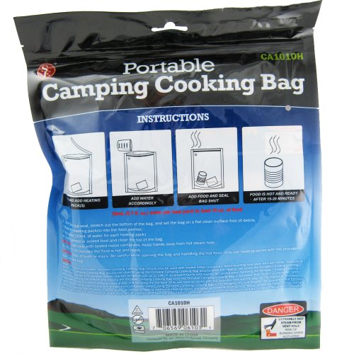 SE CA1010H Lightweight Portable Cooking Bag for Camping or Emergencies Great for a camping trip! You can leave the stove at home and go light. Heat Up Canned Food Quickly and Easily. No Fire, No Electricity! Just add Water. Lightweight and easy to carry. Heats sealed food in 15 to 20 minutes. Simple to use! Gives you more time to enjoy camping or setting up before night fall! Caution: Extremely hot steam from vent hole of bag. Risk of burning, Not to be used by children! Must use caution when opening bag also, food will be hot. Would you like to purchase more than one? We offer great discounts on quantity orders. Specifications: No Fire or Electricity Needed! Light weight easy to carry Maximum Heating Temperature: 381�F (194�C) Color Bag Left Over Materials Are Harmless To Humans and to the Environment Model Number: CA1010H Bag Includes: 10 Heating Packs 1 Measuring Cup 1 Reusable Food Warmer Bag SpecificationsBrand: SE