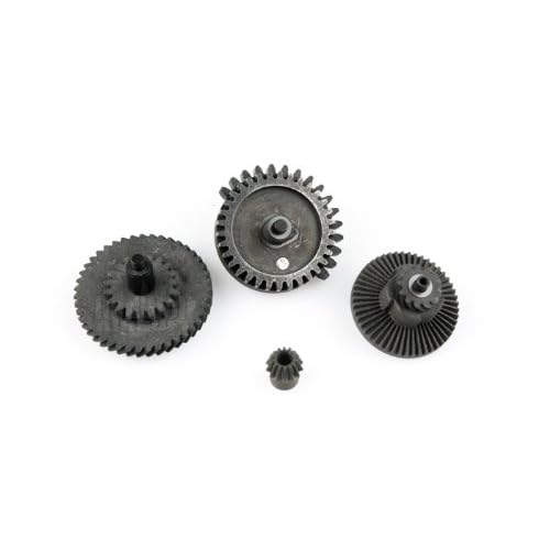 ENERGY efficient Helical gear set provides regular torque ratio to power normal or powered up springs up to M120. Lightened with carbon fiber components (not shown in photo and on other side of sector gear), these gears are 15% lighter than their predecessors). Note that regular torque ratios means the rate of fire will not be affected. Setting helical gears requires experience in working with gearboxes. Incorrectly setting these gears during installation can result in stripped gears immediately. FOR AIRSOFT USE ONLY
