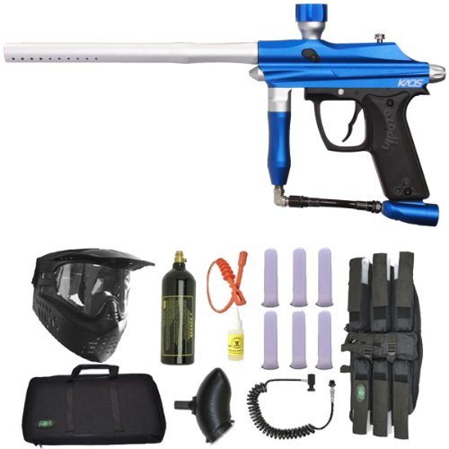 Azodin Kaos Paintball Marker Gun 3Skull Sniper Set Blue/Silver Developed with the highest standard in mind, KAOS incorporates the latest technological breakthrough, while providing standard features that are found on $1000 markers. KAOS gives players the competitive edge on the field of battle. The new feather striker system is 30% lighter than the traditional striker design. This breakthrough reduces the mechanical recoil and allows the KAOS to be the smoothest handling semi-automatic marker on the market. Overall length and the profile of the receiver body have been re-engineered to be shorter and lower. This compact design makes the KAOS one of the lightest markers at 2.1 lbs. Azodin Markers comes with a 30 day warranty. Package Includes Azodin Kaos Semi Automatic Marker 3Skull Heavy Duty Coil Remote with Quick Disconnect 3Skull Square Padded Gun Case Black GXG XVSN Mask with Visor & Anti Fog Lens 20 oz CO2 Tank with pin valve 3Skull 6+1 Deluxe Paintball Harness Black 6 - 140 Round Heavy Duty Ultimate Paintball Clear Tubes 3Skull 21" Orange Jerk Squeegee 1oz Gold Cup Oil Azodin Kaos Features Low rise twist lock feed neck Non-slip rubber grip panels self lubricate delrin bolt double ball detents 12" one piece barrel.