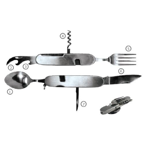New camping utensil set. This sturdy tool is made of high quality stainless steel. It includes a sharp knife, fork, spoon, corkscrew and bottle opener. A great tool for weekend camping The tool even separates, so you can use the knife and fork in different hands. It comes with its own storage bag. Folded length: 4 1/2-Inch Weight with bag: 5.3 oz.